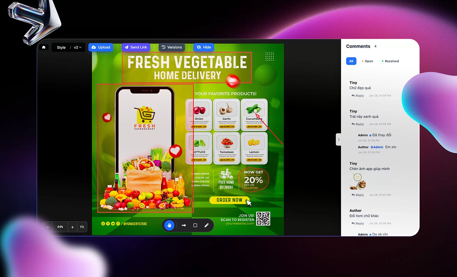 • Visual Context: Mọi bình luận đều hiển thị song song với chi tiết thiết kế, giúp Designer hiểu ngay lập tức ý định của người đánh giá mà không cần suy luận.